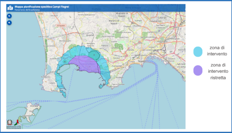Il DL 140/2023 ha individuato la “zona di intervento” nelle aree dei comuni di Pozzuoli, Bacoli e Napoli (Quartiere di Bagnoli e parte delle municipalità di Soccavo/Pianura e di Posillipo) maggiormente interessate dal fenomeno bradisismico e quindi da sismicità e deformazioni del suolo. All’interno di questa zona è stata individuata una zona di intervento “ristretta”, nella quale potrebbero registrarsi, in modo diffuso, i maggiori effetti, se il fenomeno del bradisismo dovesse proseguire e/o intensificarsi.