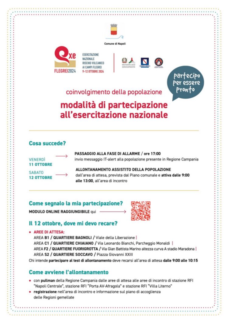 ll 12 ottobre si è svolta l’esercitazione nazionale per il rischio vulcanico ai Campi Flegrei con il coinvolgimento della popolazione che liberamente intenderà partecipare per testare le modalità di allontanamento assistito dalle aree di attesa previste dal piano comunale alle aree di incontro definite dalla pianificazione regionale di allontanamento.