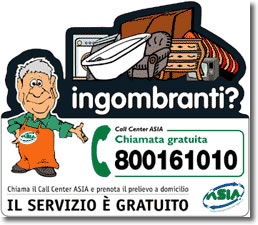 - Beni durevoli e ingombranti: servizio a richiesta previa prenotazione (numero verde 800.161010, dalle 08.00 alle 18.00 dal lunedì al venerdì e dalle 09.00 alle 13.00 il sabato).