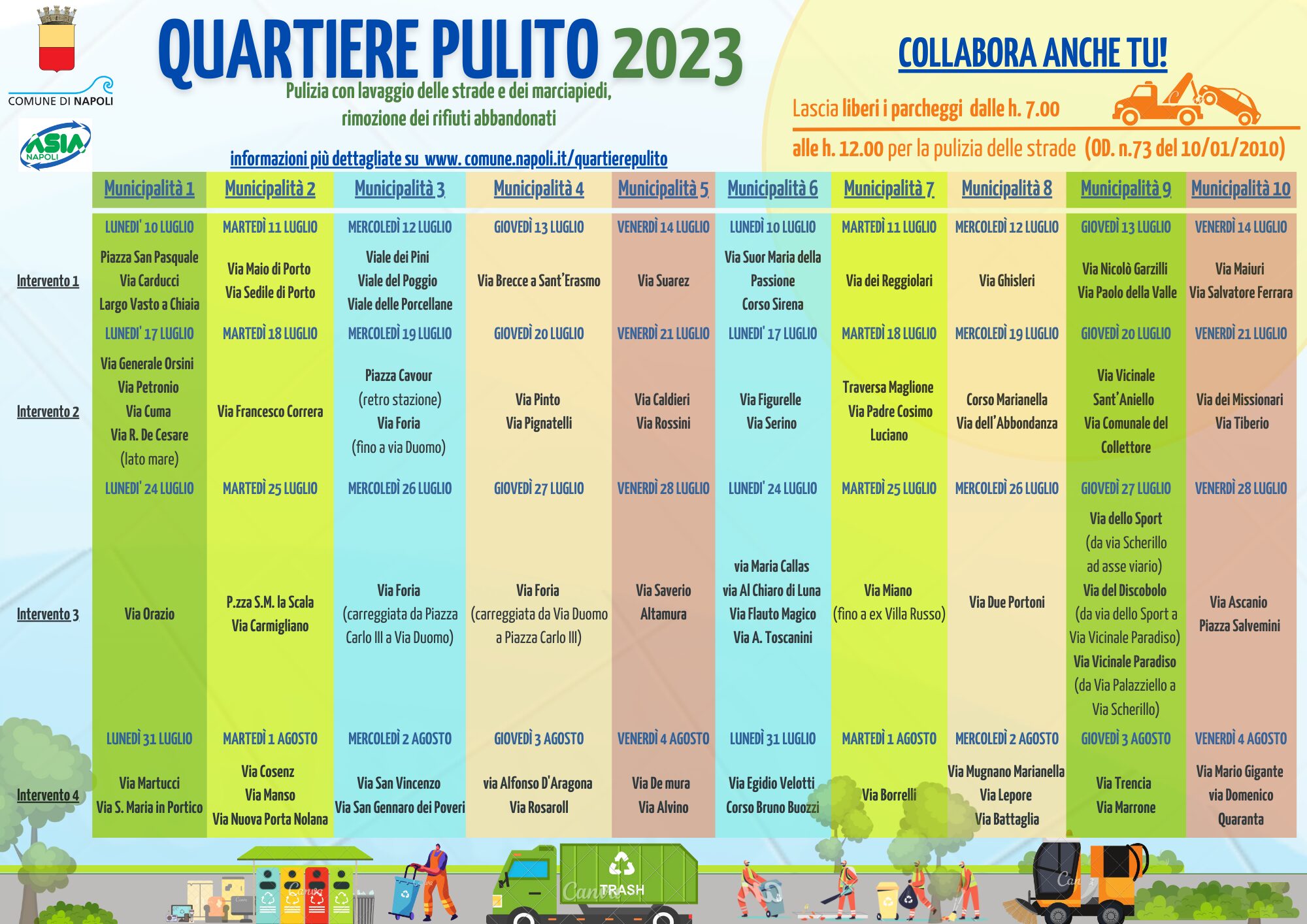 Prosegue Quartiere Pulito 2023, che interessa 72 strade e 4 piazze delle dieci Municipalità, nelle quali verranno effettuati interventi di pulizia radicale, con diserbo, spazzamento e lavaggio dei marciapiedi e rimozione delle campane per la pulizia delle aree sottostanti e per alcune anche della ripulitura delle caditoie.