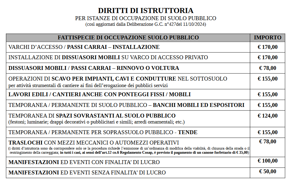 Per l’occupazione devi pagare il canone calcolato in base alle tariffe giornaliere, per metro quadrato e per tipologia d’occupazione, approvate dalla Giunta.