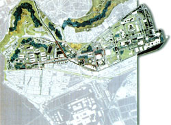Tale progetto si qualifica per la forza di struttura dell’asse del viale Giochi del Mediterraneo che realizza in modo concluso la riunione tra l’area della Mostra d’Oltremare e l’area dell’ex Collegio Ciano. In particolare si evidenzia la struttura di collegamento pedonale che filtra i percorsi della zona della Mostra per immetterli nel tracciato fondamentale dell’asse, che si organizza diversamente nel primo tratto ad attrezzatura collettiva e nel tratto centrale come collegamento tra i due ponti per concludersi nella parte terminale con andamento più organico e confacente con la sistemazione paesaggistica. La giuria ritiene interessante la soluzione di connessione pedonale tra il piazzale sopraelevato dell’ex Collegio Ciano e la stazione FS, indipendentemente dall’ipotesi a destinazione a Centro Congressi proposta dal progetto, anche se in contrasto con le previsioni della variante stessa. Si evidenzia la soluzione positiva del potenziamento dei collegamenti con il viale Campi Flegrei e la via Silla. Nell’ambito dell’organizzazione generale il progetto interviene con soluzioni e proposte riguardanti la circolazione e le destinazioni in aree esterne al comparto oggetto del concorso, anche se tali indicazioni entrano a volte in contrasto con quanto stabilito dalla variante. In particolare a questo proposito si segnala come il collegamento tra la parte terminale dell’asse del viale Giochi del Mediterraneo con via Domiziana, sia in contrasto con la logica di tutela dell’ambito naturale della collina di san Luise, e sembra anche che la soluzione terminale dell’asse del viale Giochi del Mediterraneo, nel prosieguo che supera il confine del comparto, avrebbe potuto essere strutturato in modo più confacente con la sistemazione del sito proiettato verso il mare.