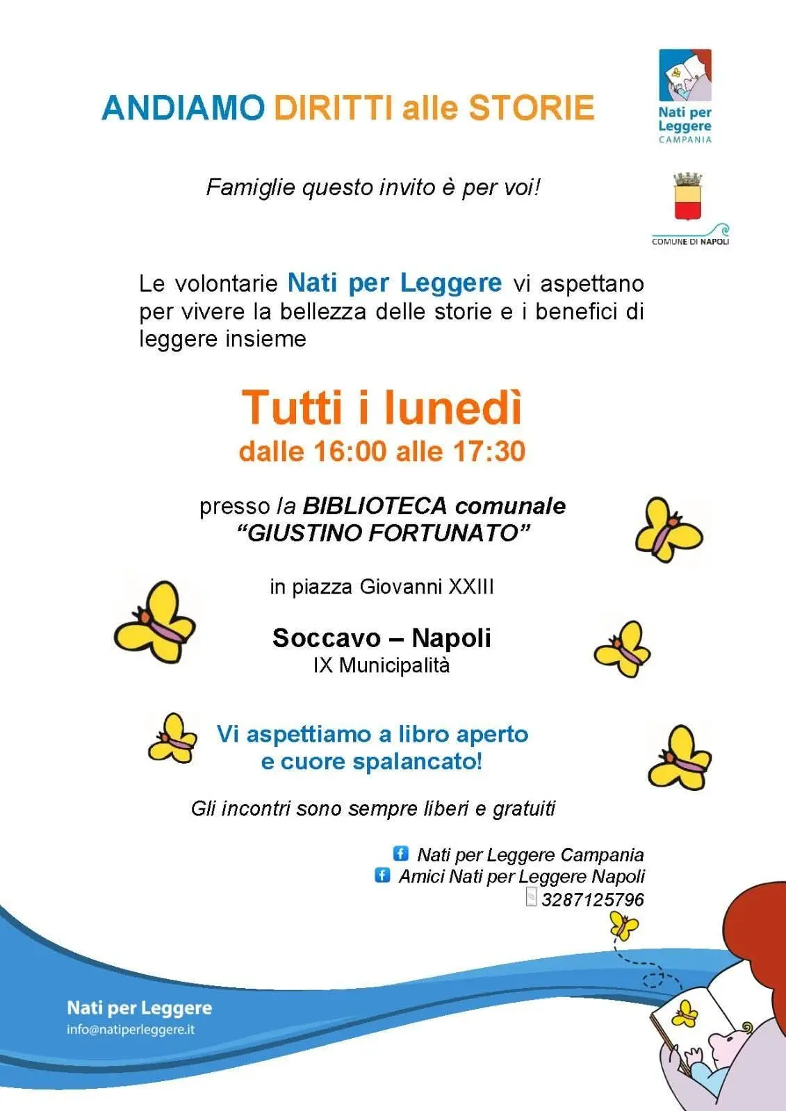 Tutti i lunedì - dalle ore 16:00 alle ore 17:30 - in Biblioteca Giustino Fortunato a Soccavo, al piano terra della Municipalità in Piazza Giovanni XXIII, le volontarie ed i volontari di Nati per Leggere aspettano i bambini con loro accompagnatori per leggere insieme.