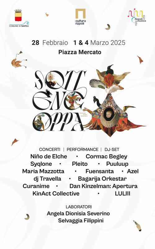 Con tre giorni di festa (28 febbraio, 1 e 4 marzo, ore 19:00-00:00), che fondono musica, performance e ritualità, Sottencoppa conferma la vocazione sonora e visionaria del carnevale partenopeo, invitando un pubblico di tutte le età a vivere un’esperienza collettiva di trasformazioni e mascheramenti che celebra e rinnova la tradizione nell’incontro con suggestioni che attraversano diverse epoche e geografie; un’esperienza sonora che celebra la multiculturalità attraverso la musica.