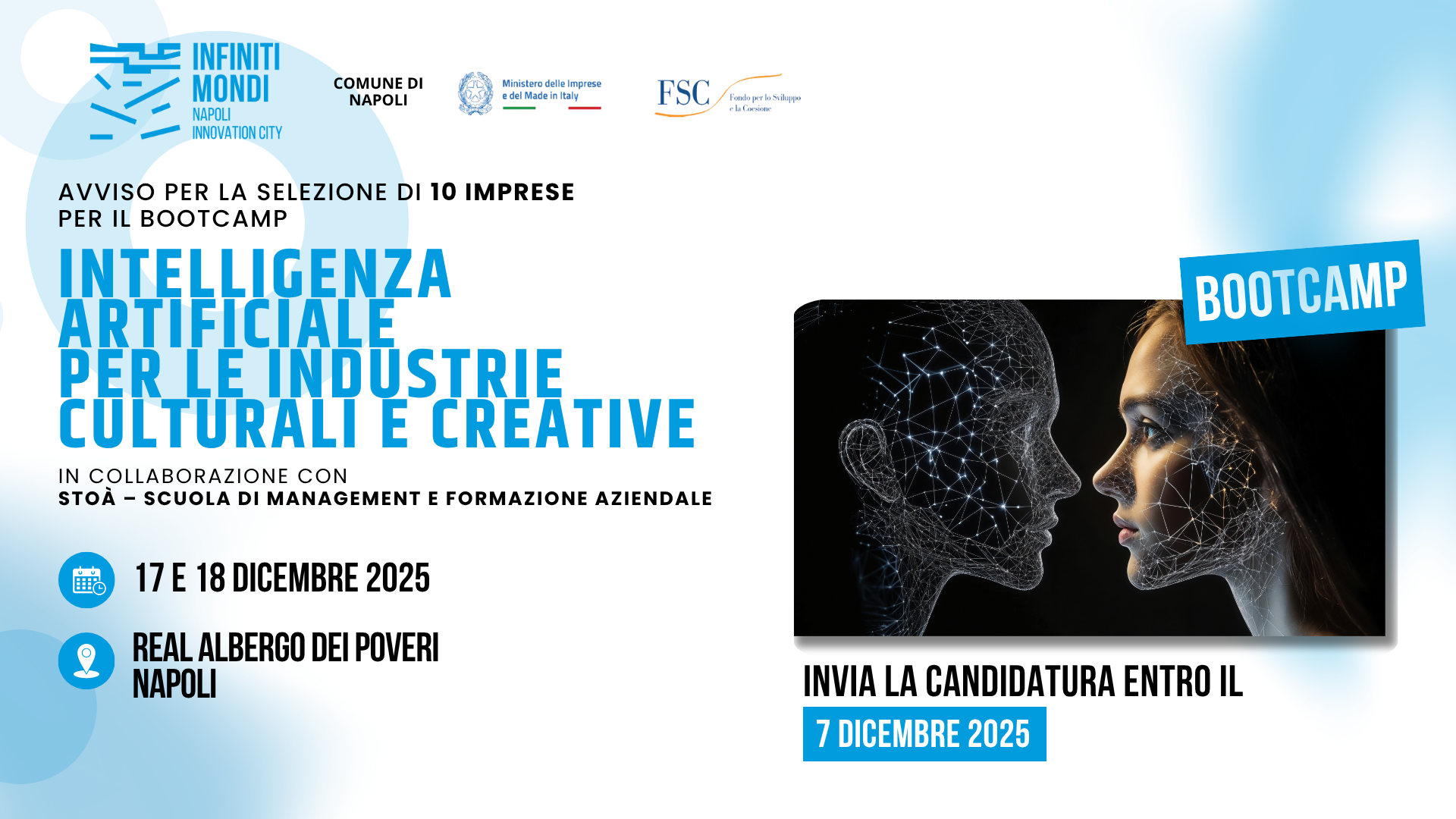L’Avviso è finalizzato alla selezione di 10 imprese che avranno l’opportunità di partecipare, a titolo gratuito, a un Bootcamp sull’Intelligenza Artificiale per le Industrie Culturali e Creative, della durata di 2 giorni, che si terrà nei giorni mercoledì 17 e giovedì 18 dicembre 2025 a Napoli, dalle ore 9:30 alle ore 17:30, presso i laboratori della Casa Tecnologie Emergenti del Comune di Napoli al Real Albergo dei Poveri, in Piazza Carlo III, n. 1.