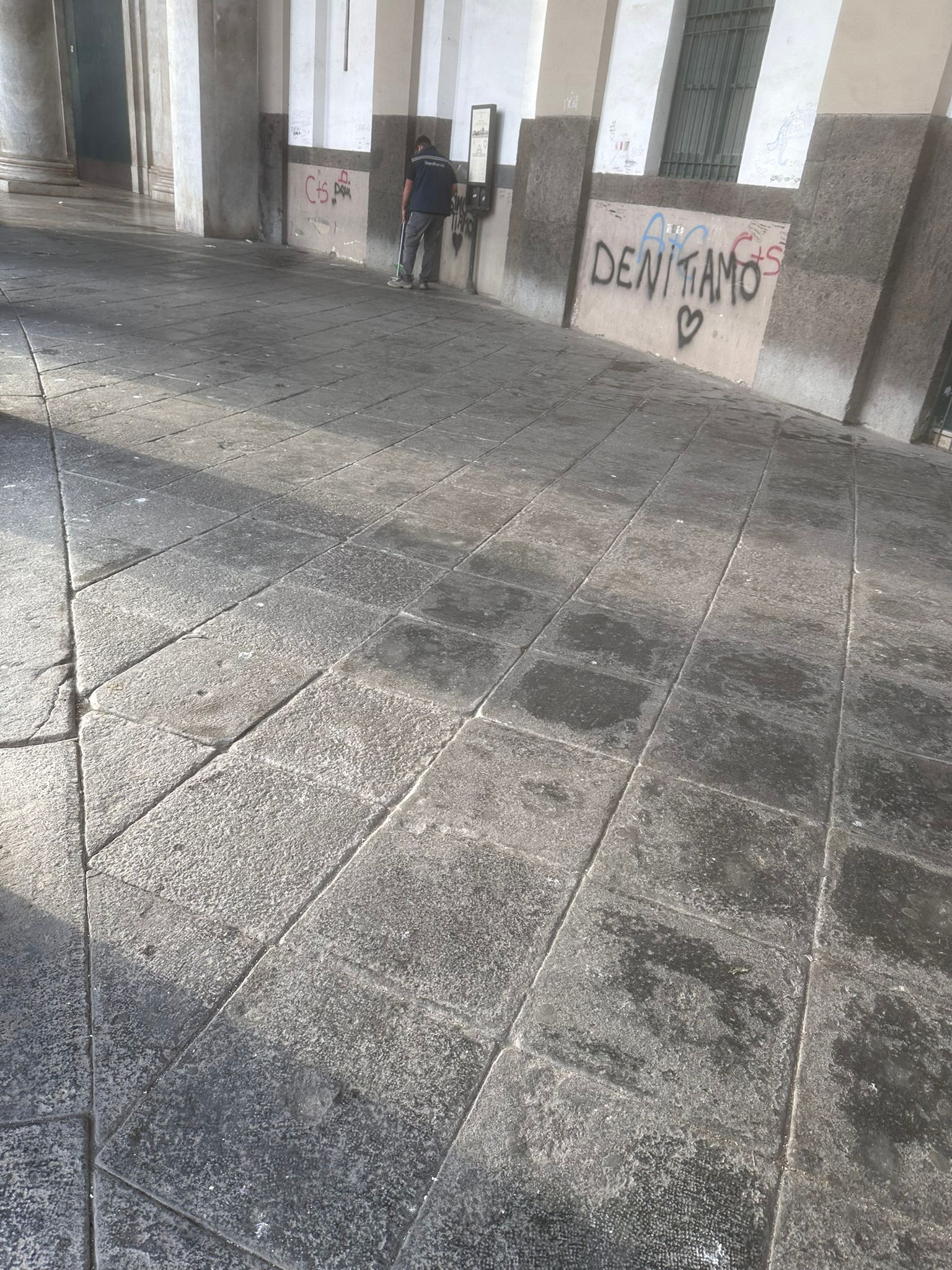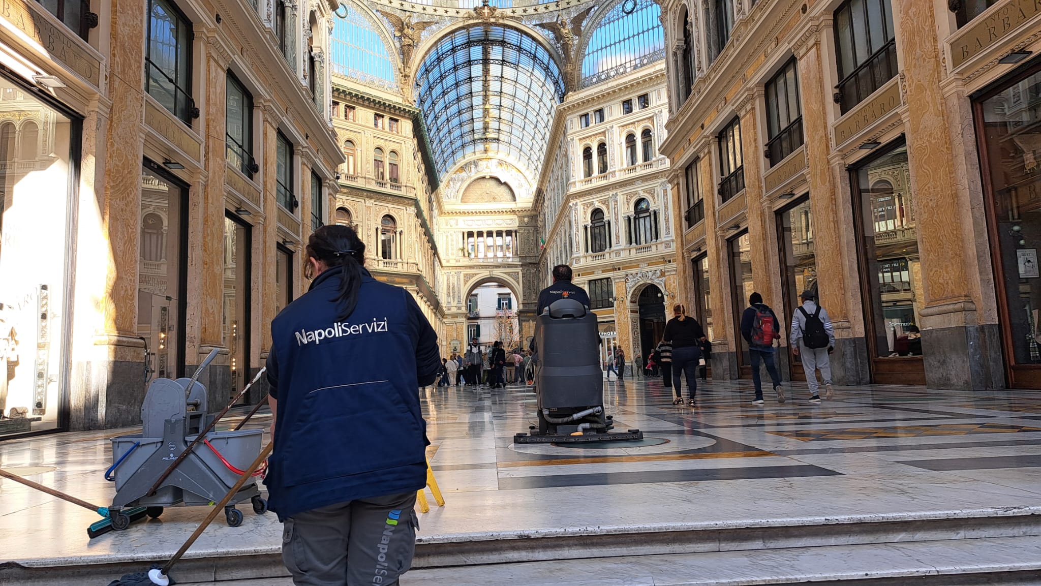 In piazza del Plebiscito è stata ripulita l’area del porticato e i gradini di accesso, mentre nella galleria Umberto I Napoli Servizi ha effettuato un intervento specifico sulla pavimentazione in marmo.