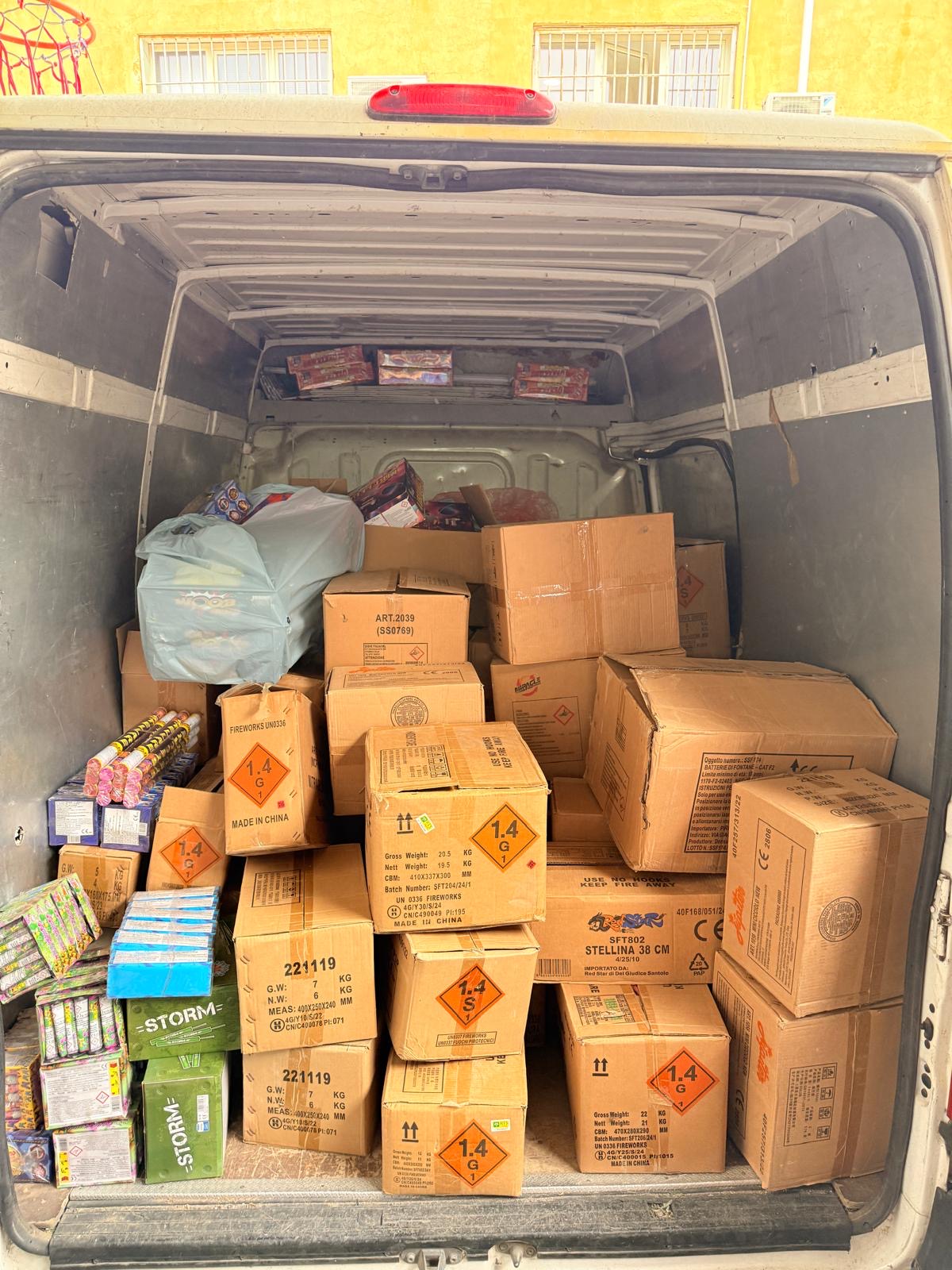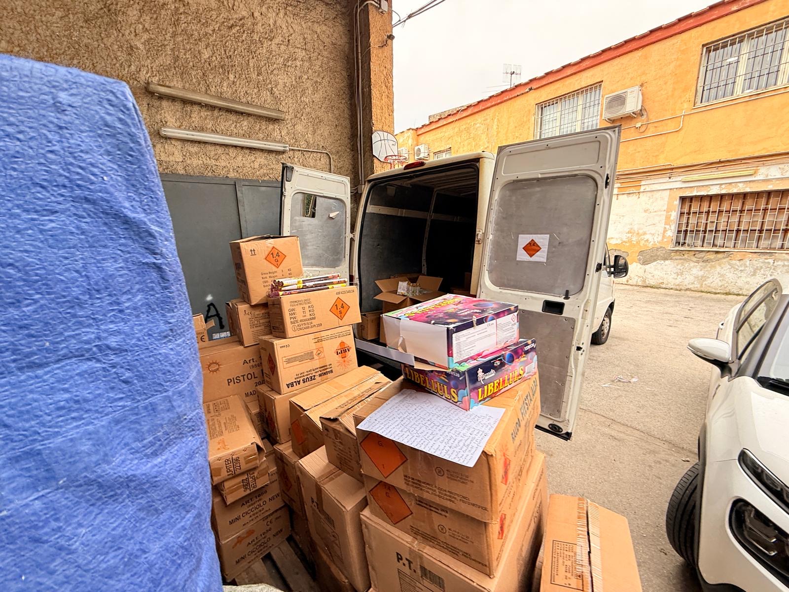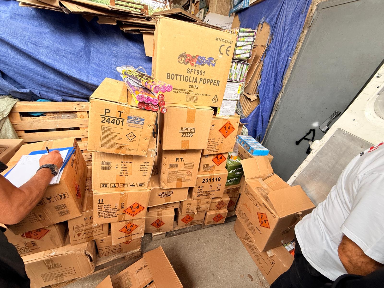 Il nucleo dell'intervento è stato il rinvenimento, all’interno del piazzale, di un furgone utilizzato come deposito abusivo di sostanze esplosive. All'interno del mezzo, privo di qualsiasi autorizzazione prevista dal Testo Unico delle Leggi di Pubblica Sicurezza (T.U.L.P.S.), era stipato un ingente carico di materiale pirotecnico, tra cui fuochi d’artificio, petardi, fontane e bengala, per un peso complessivo di circa 100 chilogrammi.