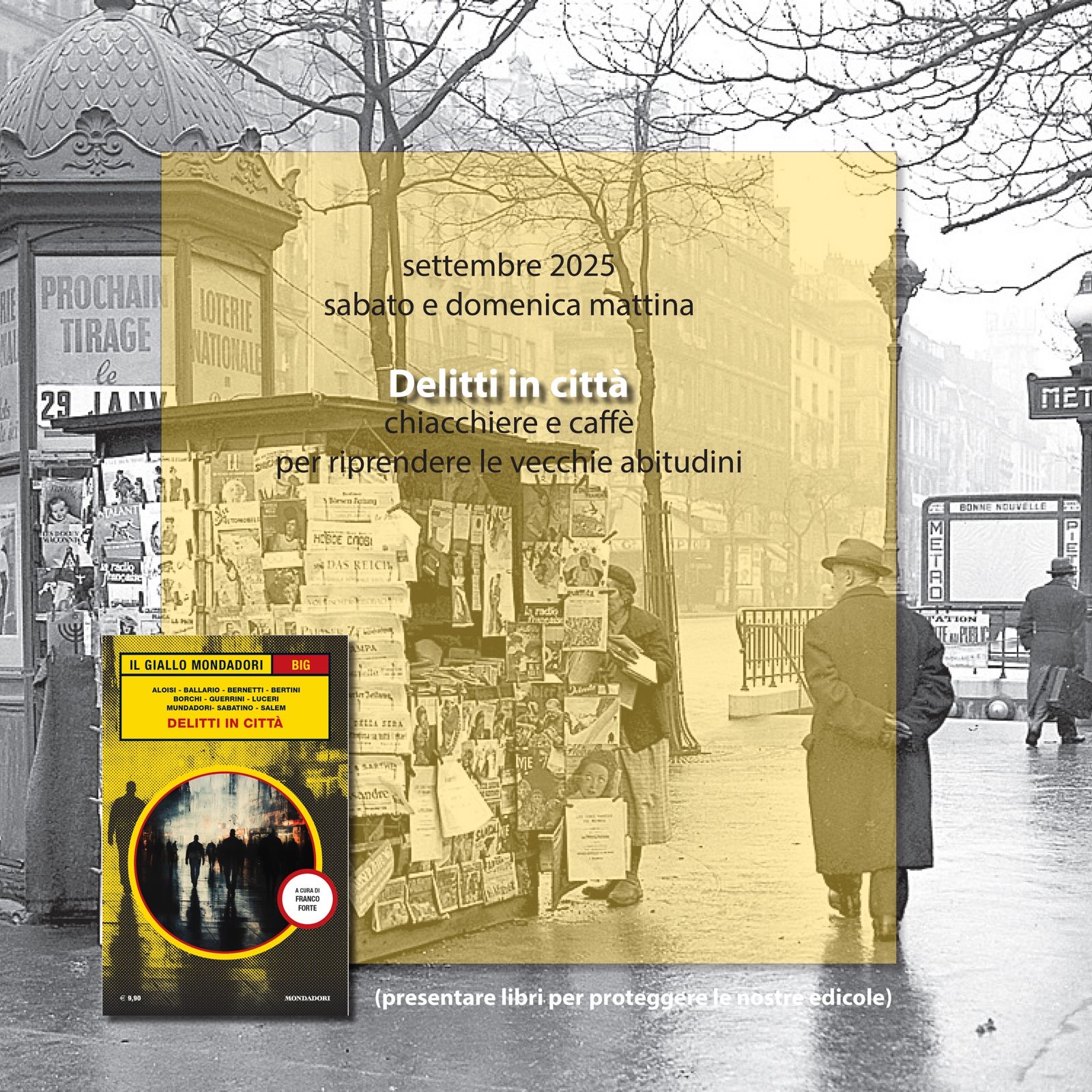 A partire da domenica 14 settembre, per 6 domeniche consecutive, all’alba – alle ore 8:30, orario simbolico e profondamente legato al mondo delle edicole – alcuni degli autori della nuova antologia “Delitti in Città” (Il Giallo Mondadori Big) incontreranno il pubblico presso sei edicole storiche della città.