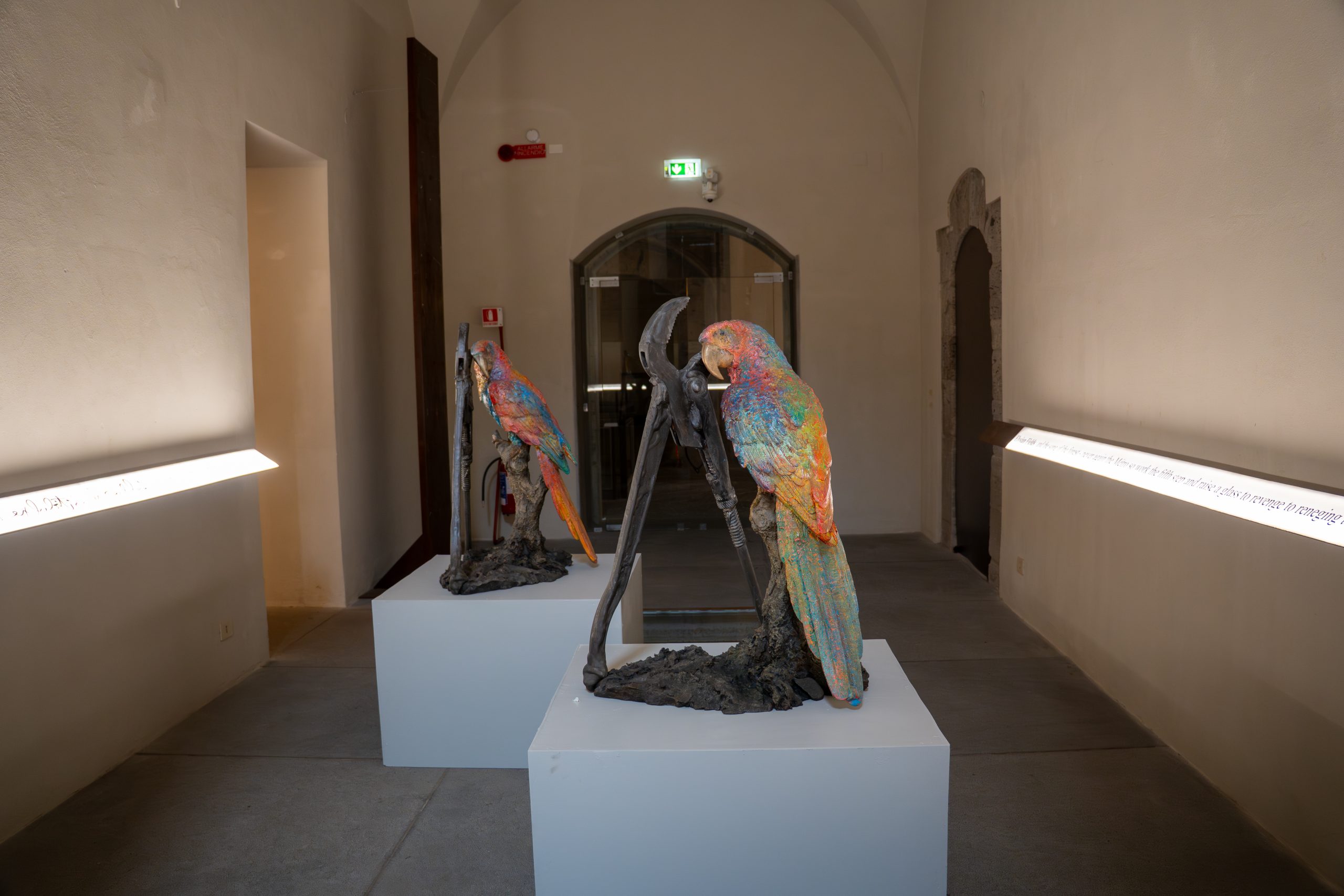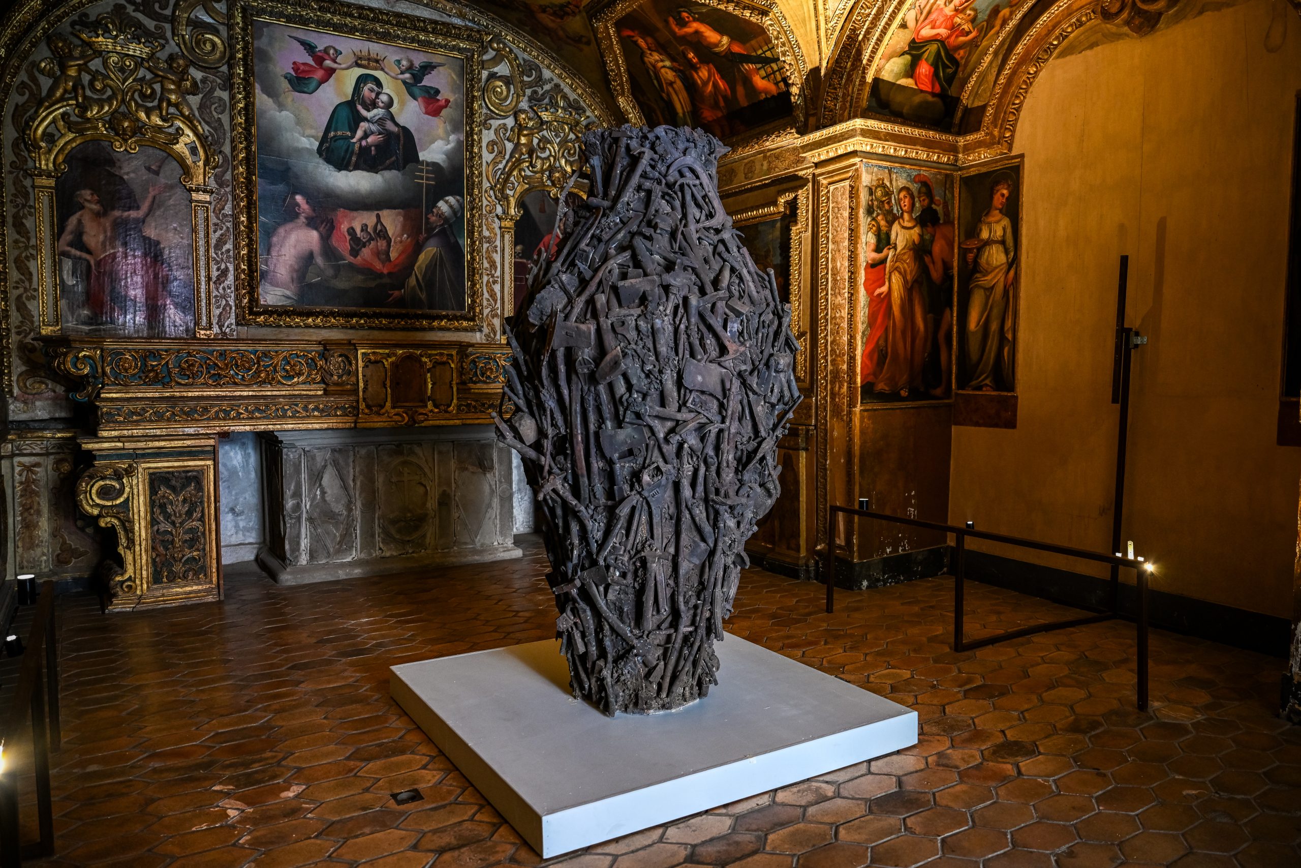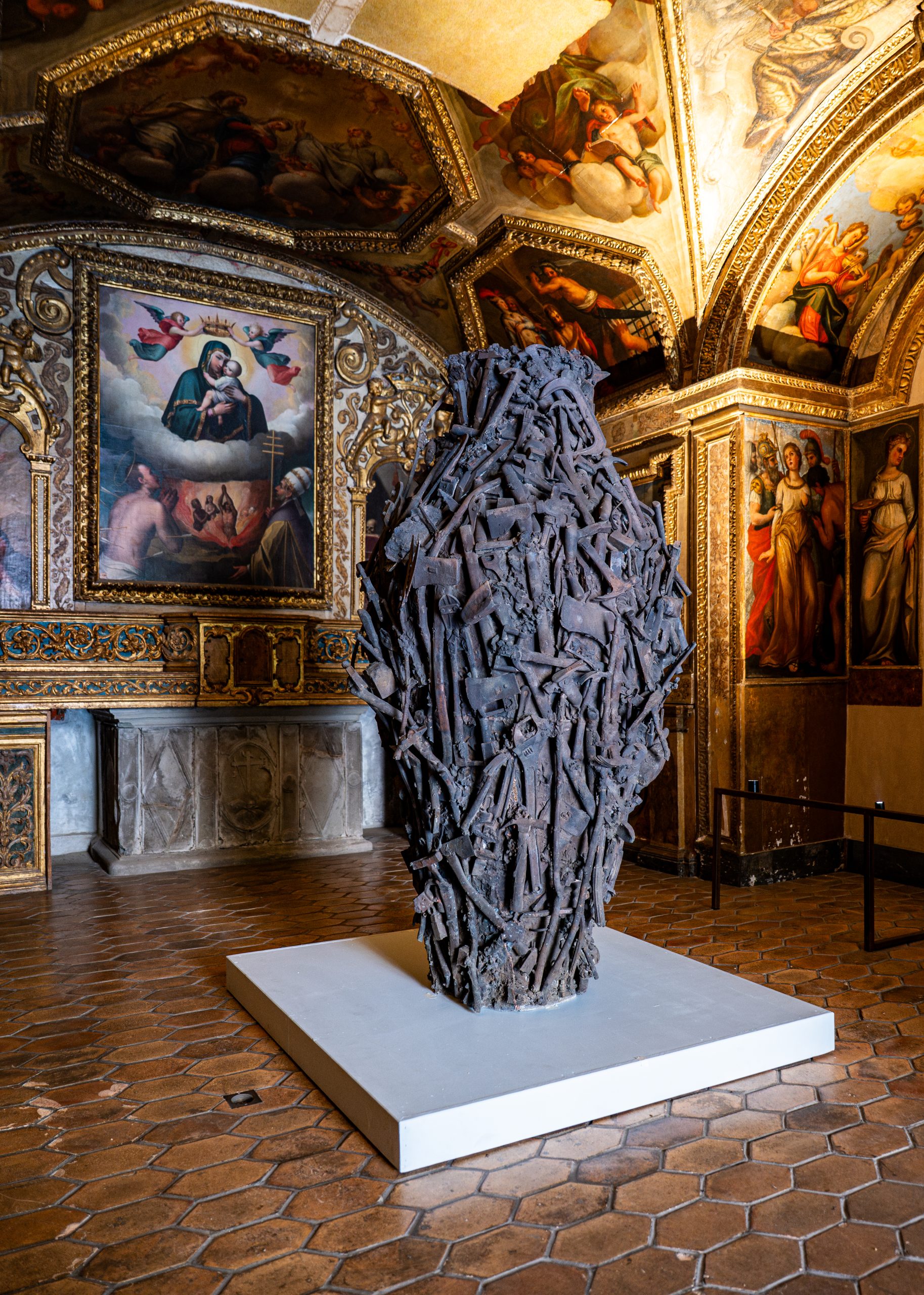 Da questa idea nascono sculture che ricordano da vicino rovine pescate dagli abissi marini. Ecco esercizi fisiognomici imperfetti non privi di rimandi autobiografici (Elysian Fields, nella Cappella Palatina). Ed ecco The Gate where Venus sleeps, una porta in bronzo e in acciaio, collocata in corrispondenza dell’abside della Cappella Palatina, simile a un altare fatto di attrezzi poveri. Ecco ancora alcune divinità acefale, la cui bellezza originaria è resa irriconoscibile da una selva di stratificazioni (Venus and Neptune, nella Sala dell’Armeria). Ed ecco Flowers (nella Cappella delle Anime del Purgatorio), un solenne vaso in bronzo nel quale sono incastonate reliquie varie. Infine, le scritture a mano, riportate in una piccola stanza del Castel Nuovo: come graffiti nervosi incisi in una cripta.