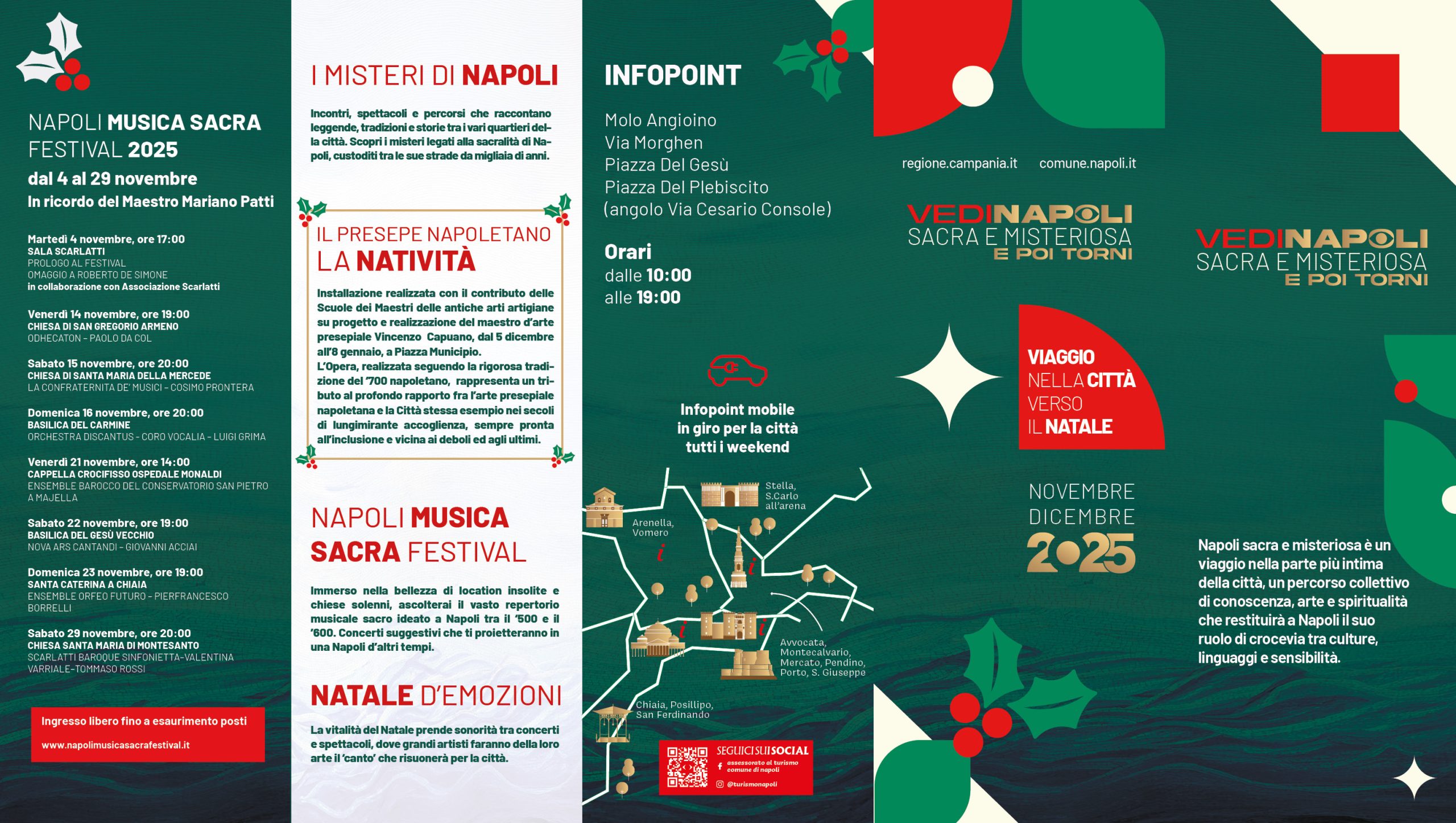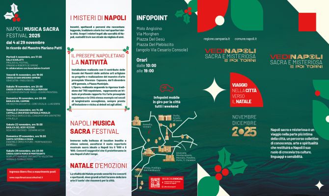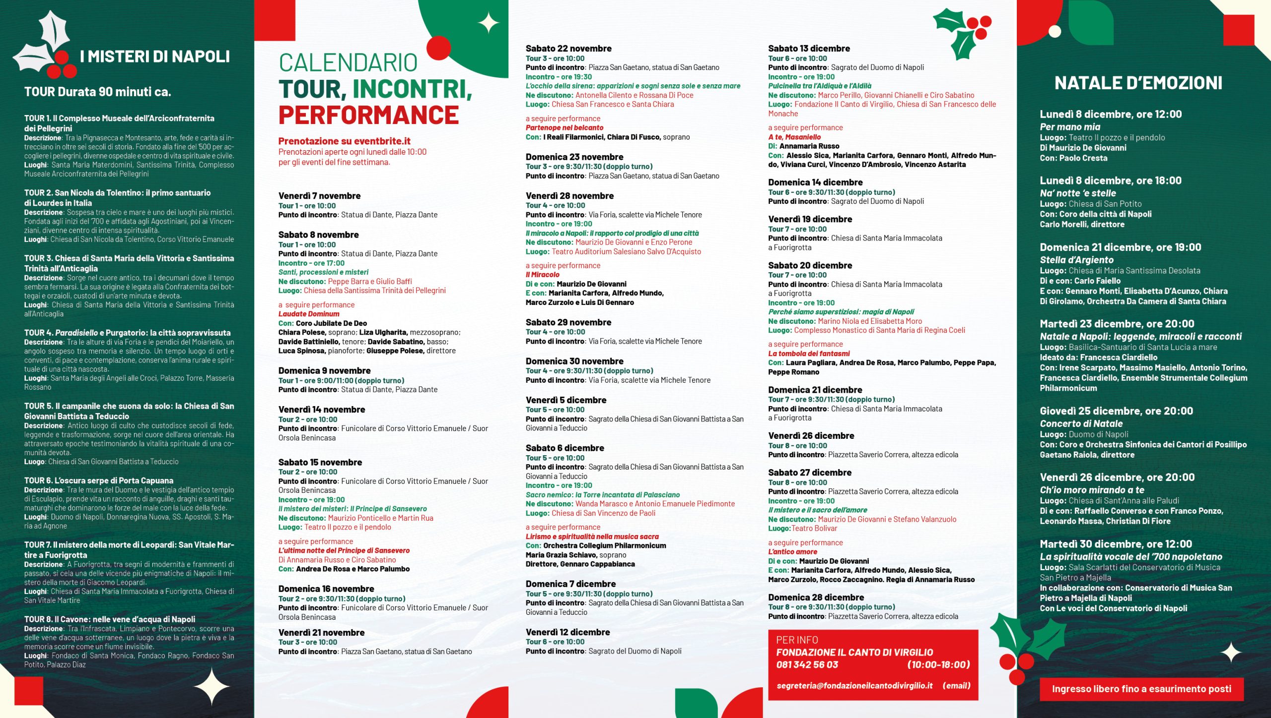 Il programma è suddiviso in quattro sezioni. I Misteri di Napoli, a cura della fondazione Il Canto di Virgilio, si compone di otto tour, con 32 visite guidate alla scoperta dei misteri legati alla sacralità di Napoli, che attraverseranno diversi quartieri, da Fuorigrotta a San Giovanni a Teduccio, passando per il centro antico, dove esplorare chiese, conventi, confraternite, palazzi e fondaci, arricchiti da incontri di approfondimento e performance inedite, in cui scrittori, artisti e studiosi di fama nazionale e internazionale racconteranno la dimensione sacra e misteriosa della città. Napoli Musica Sacra Festival 2025, a cura del Maestro Luigi Grima, propone otto concerti dedicati al vasto repertorio musicale sacro ideato a Napoli tra il Cinquecento e il Seicento. La Natività, realizzata con il contributo delle Scuole dei Maestri delle Antiche Arti Artigiane di Napoli, su progetto del Maestro Presepaio Vincenzo Capuano, sarà installata in piazza Municipio dal 5 dicembre all’8 gennaio. Natale d’Emozioni, a cura della fondazione Il Canto di Virgilio, un programma di sette concerti e spettacoli con grandi artisti che faranno della loro arte il “canto” che risuonerà per la città.