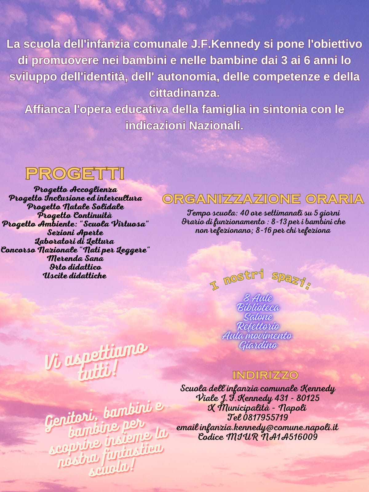 Contatti Scuola dell’infanzia Kennedy Telefono: 00390817955719 E-mail: infanzia.kennedy@comune.napoli.it